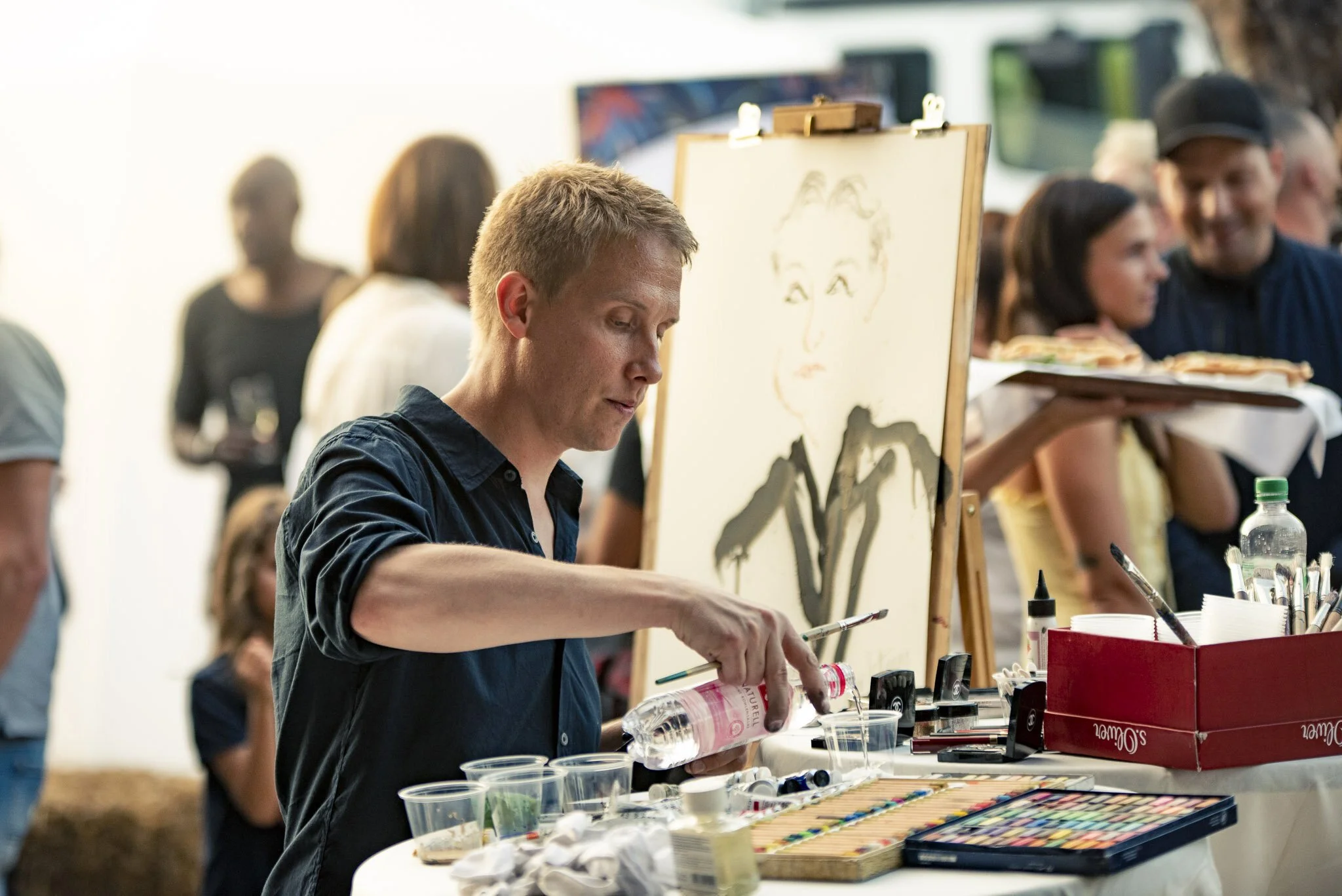 I will setup my ‘Traveling Atelier’ at the event location to create live illustrations of predetermined subjects. The default setup includes a drawing easel and one or two tables for my materials as well as optional studio lights, backdrops, and custom gift boxes. Setting up and breaking down typically takes 1-2 hours and ideally happens a day before and after the event. Setting up in advance also creates excitement for the upcoming event, especially in-store and gallery spaces and can include a showcase of previous works. As agreed together with the client I will either work for a specified duration of time or do a fixed number of artworks. I can do around 3-7 live illustrations per hour depending on complexity and scale. This number enables each guest to have a truly personal and interactive art experience. Establishing a timed appointment system for portraits is advised to help maximize the number of works. The resulting original illustrations will be signed and dated and packaged in customized gift boxes or clear art sleeves. The works should ideally be allowed to dry overnight to prevent smudging. We can also digitize the works before handing them out for commercial and documentary purposes.