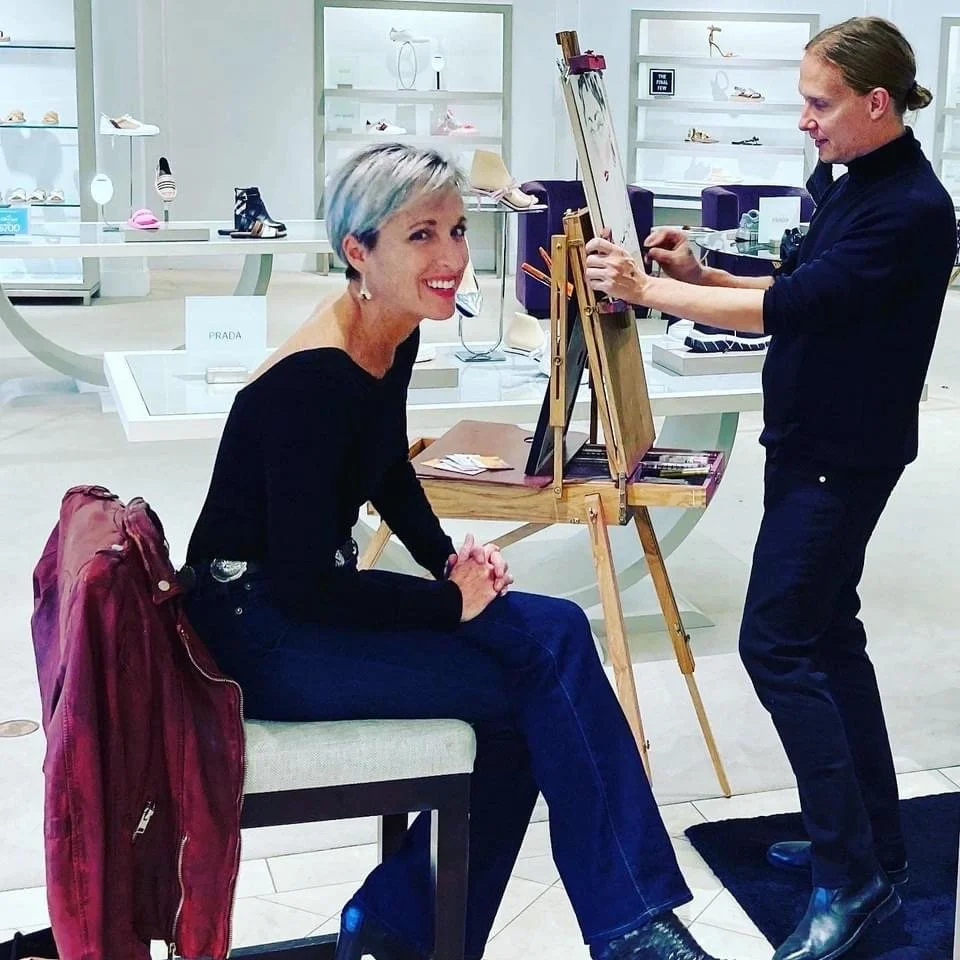 Live portrait drawing at Saks Fifth Avenue Cincinnati store Beauty Event in September 2021 with featured cosmetic products.